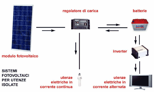 schema di funzionamento di un impianto solare fotovoltaico isolato